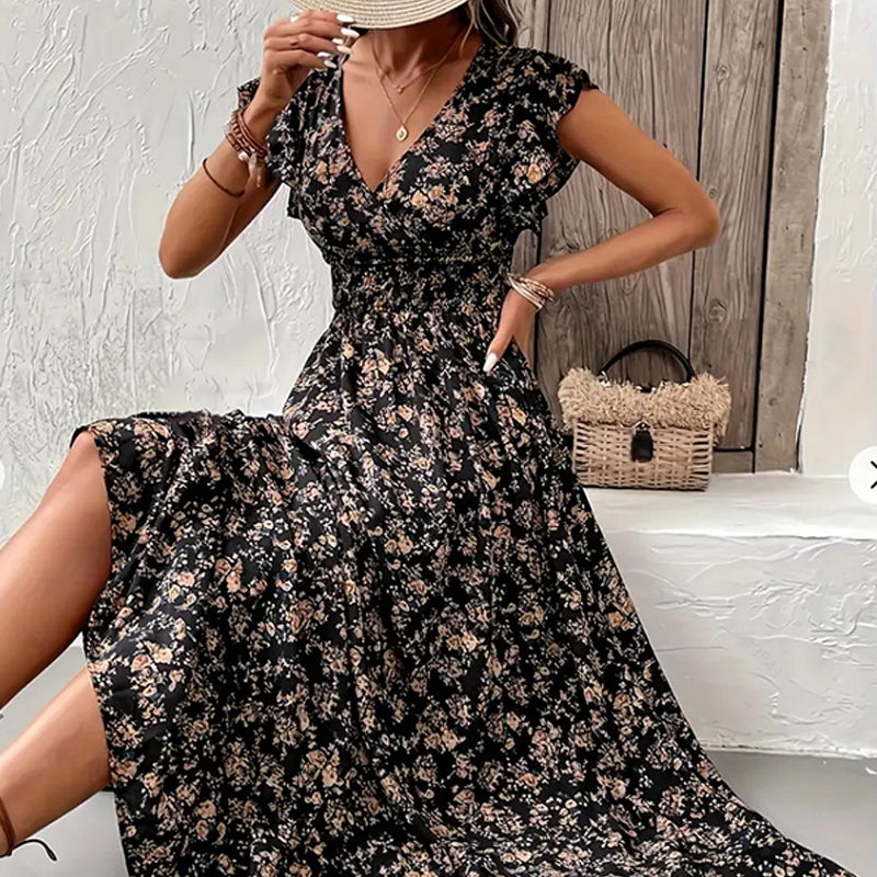 Lieferumfang: 1 × fließendes Maxikleid mit V-Ausschnitt und Blumenmuster