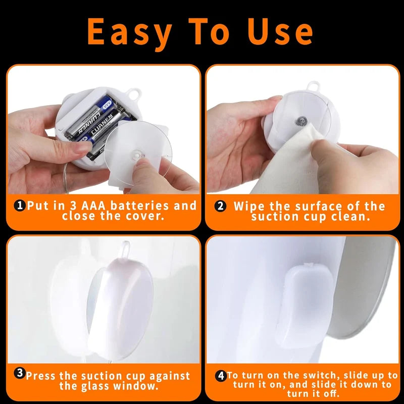 Unsere LED-Fensterleuchten sind für eine einfache Anwendung und Vielseitigkeit konzipiert. Die Rückseite des Batteriekastens hat Saugnapf und Aufhängeloch, kann leicht installiert werden oder Hand auf verschiedenen Oberflächen wie Glas, Türen, Schränke, Wände und mehr. Diese beiden Designs bieten Komfort und Flexibilität in verschiedenen Situationen