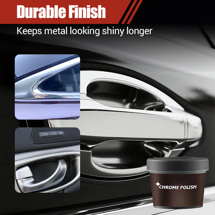 HÄLT LÄNGER DIE HELLIGKEIT – VERLÄNGERTE LEBENSDAUER : Regelmäßige Anwendung erhält nicht nur den Glanz des Chroms, sondern reduziert auch Rost und Verschleiß im Laufe der Zeit. Durch die Beibehaltung des ursprünglichen Aussehens bleiben Ihre Autoteile und Haushaltsgeräte länger haltbar und in gutem Zustand, wodurch die Notwendigkeit eines frühzeitigen Austauschs verringert wird.