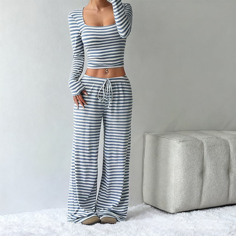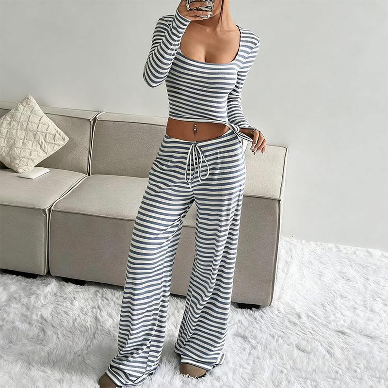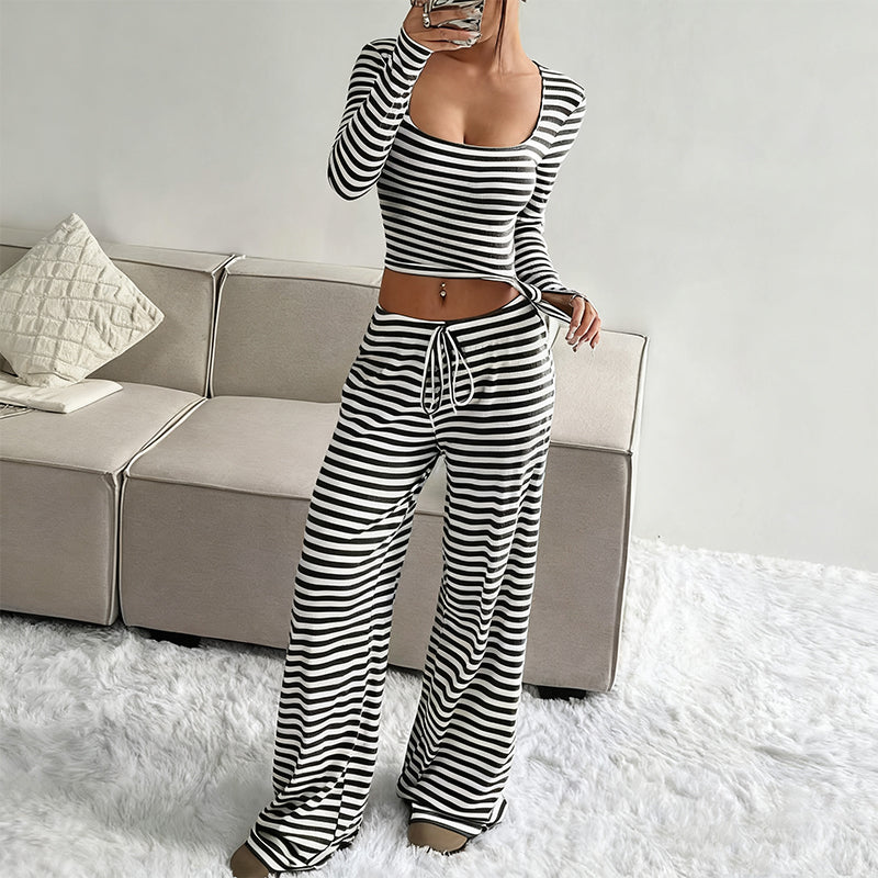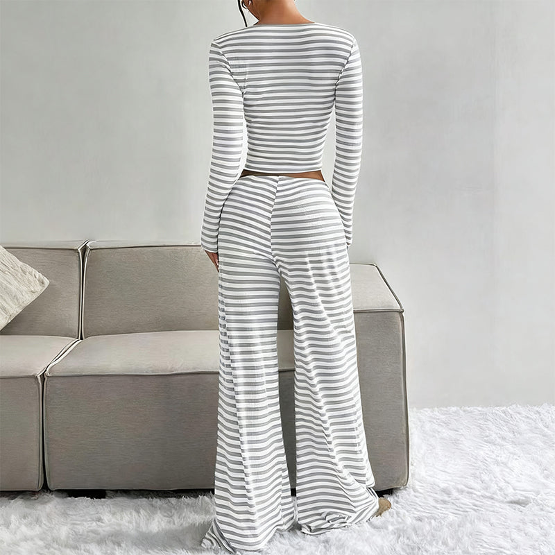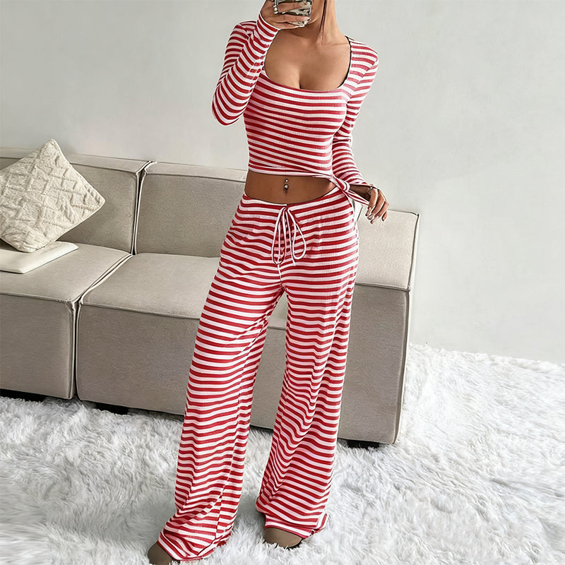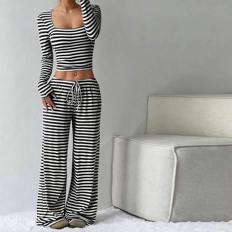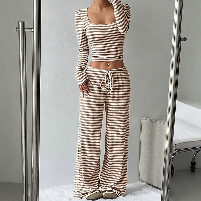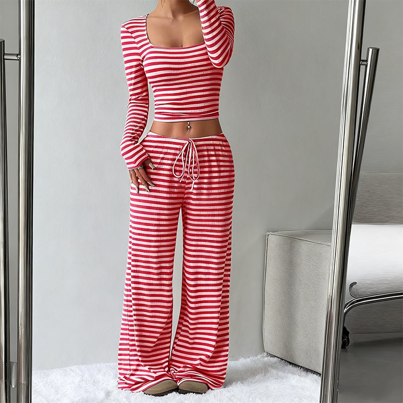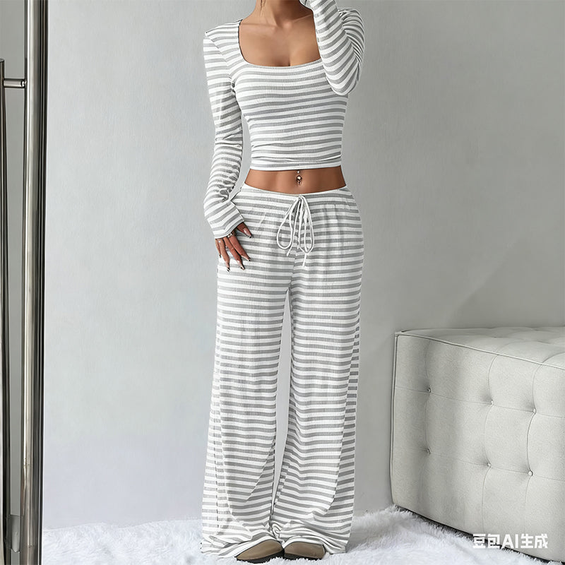❄️ LETZTER TAG – 50% RABATT 💖 Gestreiftes Gestricktes Slim-Fit-Top & Weitbein-Hose-Set